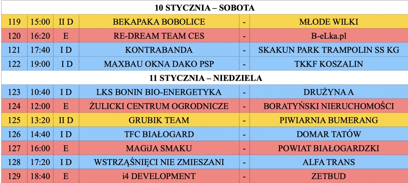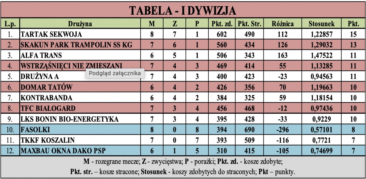 W I Dywizji Skakun Park Trampolin SS KG w derbach Kołobrzegu pokonał Wstrząśniętych Nie Zmieszanych 88-78. Pomysłem na wygranie meczu była duża zespołowość i bardzo dobra skuteczność, co pozwoliło tej drużynie schodzić z parkietu z tarczą. TFC Białogard nie podołał LKS Bonin Bio-Energetyka i przegrał mecz 49-53. Co z tego, że białogardzianie mieli olbrzymia przewagę pod koszem, skoro ich skuteczność wołała o pomstę, 27 % , to naprawdę skuteczność słabiutka. TKKF Koszalin walczył dzielnie, próbował wszystkiego i jeśli spojrzymy w statystyki, to niczym nie odbiegał od Drużyny A, ale „diabeł tkwi w szczegółach” i to słupszczanie ostatecznie wygrali 61-57. Fasolki ponownie póki miały siły, to były równorzędnym rywalem dla Tartaku Sekwoja, ale idąc w mecz głębiej, niestety nie stało im sił i ulegli Tartakowi 45-85.