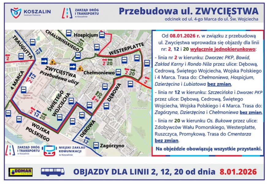 Autobusy pojadą ulicami: Dębowa – Cedrowa – św. Wojciecha – Wojska Polskiego – 4 Marca.