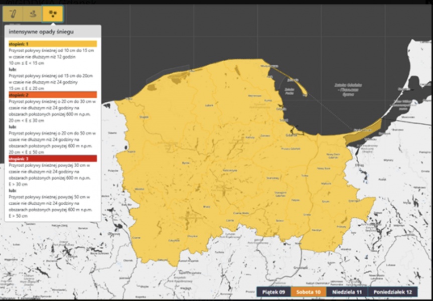 Synoptycy zwracają uwagę, że w weekend 10–12 stycznia w woj. pomorskim śnieg może padać szczególnie wydajnie (tzw. „sea-effect snow”), co miejscami może przełożyć się na znaczący przyrost pokrywy śnieżnej i spadek widzialności.