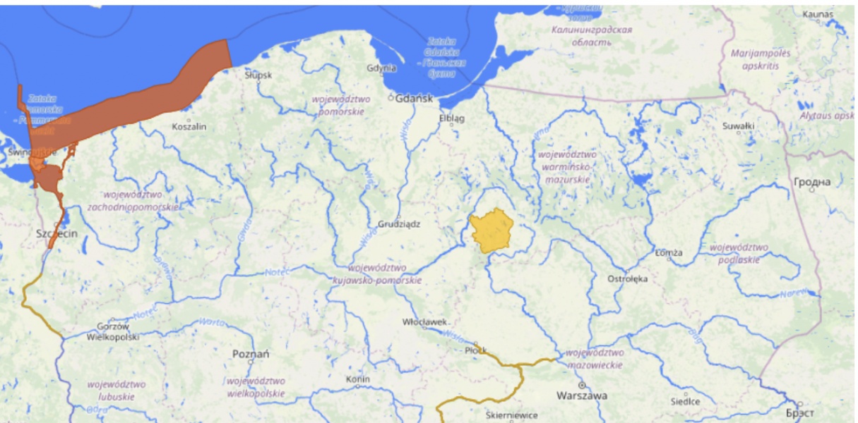 Wybrzeże Zachodnie i morskie wody wewnętrzne RP – Bałtyk Południowy, Cieśnina Świna (zachodniopomorskie), Zalew Szczeciński, Odra od Gryfina do ujścia (zachodniopomorskie).