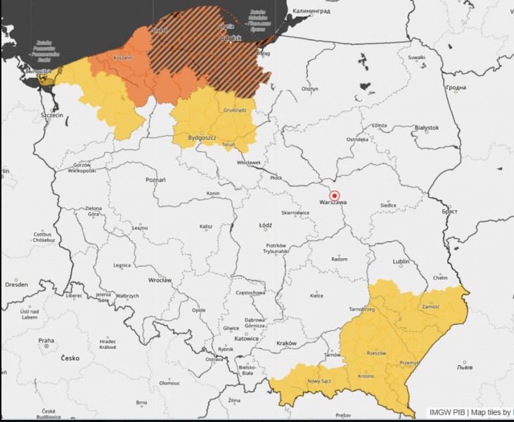 Wiatr na północy i na wybrzeżu ma być silniejszy: w porywach do 60 km/h, a na wybrzeżu nawet do 85 km/h, co – w połączeniu z opadami – będzie sprzyjać zawiejom i zamieciom. Podobne zjawiska możliwe są wysoko w górach.