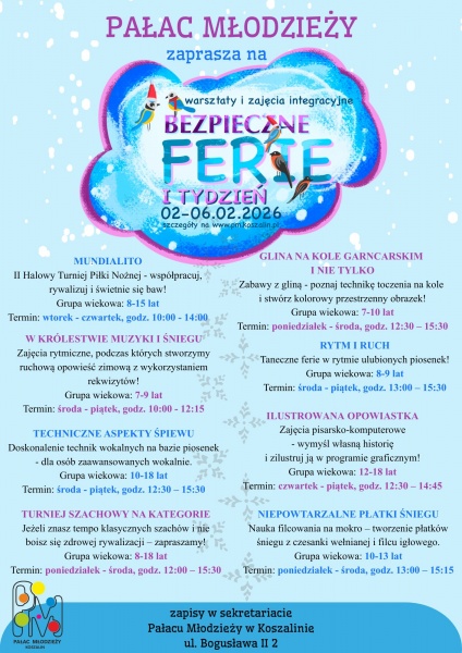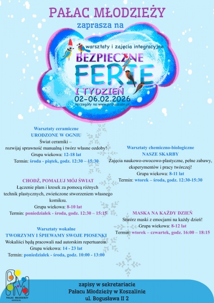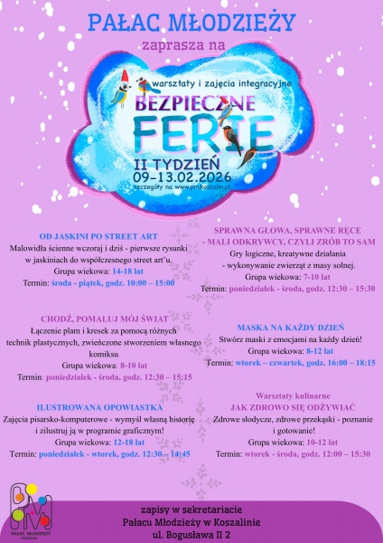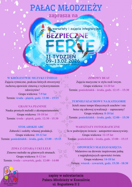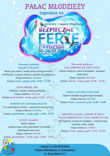 Ferie z Pałacem Młodzieży zaplanowano na 2–13 lutego 2026 r.. Zajęcia są kierowane do dzieci i młodzieży w wieku 7–18 lat, przy czym część propozycji obejmuje także starszą młodzież (np. warsztaty wokalne do 23 lat). Zajęcia odbywają się w blokach dwu- i trzydniowych, co ułatwia wybór i dopasowanie do rodzinnych planów.