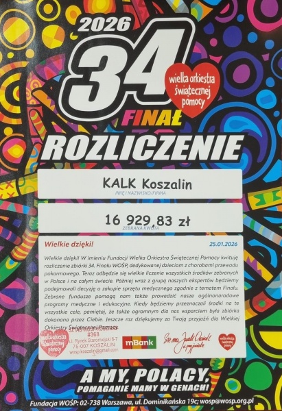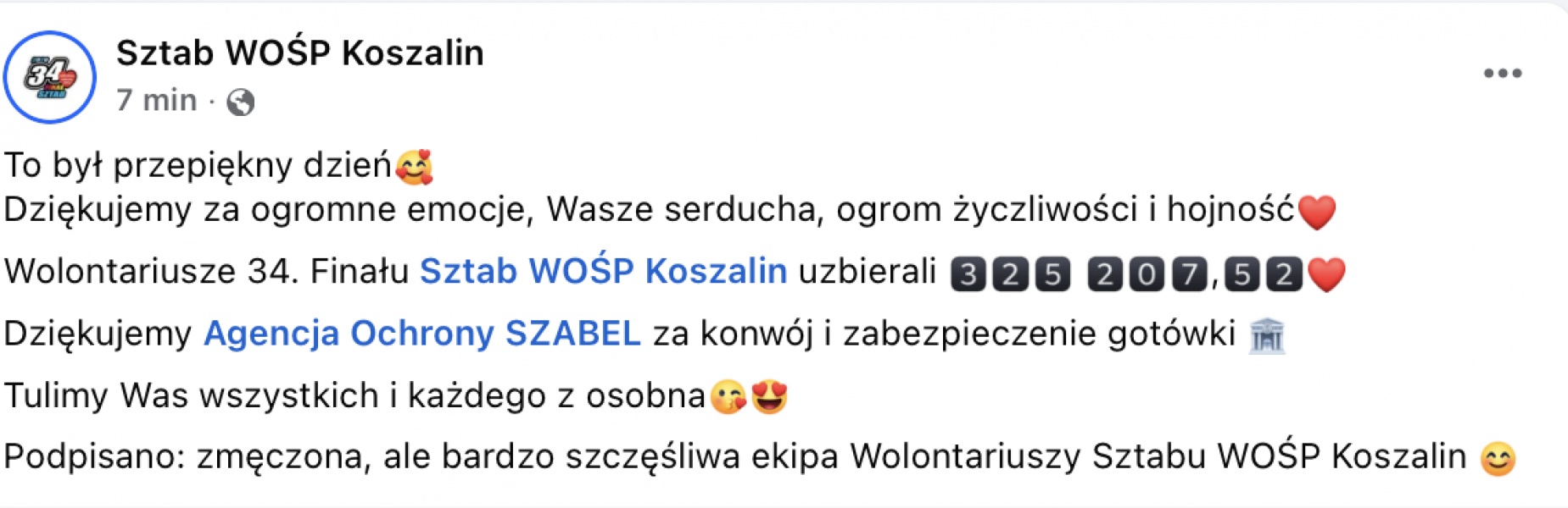 To wynik, który pokazuje skalę zaangażowania mieszkańców, darczyńców, firm i wszystkich osób, które włączyły się w kwestowanie oraz licytacje. Wśród wielu cegiełek były też te „lokalne i konkretne” – jak choćby rozliczenie jednej z grup, która przekazała do puli 16 929,83 zł, potwierdzając, że nawet pojedyncze środowiska potrafią dołożyć do finału naprawdę mocny wynik. Organizatorzy podziękowali również tym, którzy dbali o bezpieczeństwo zbiórki Agencji Ochrony SZABEL – za konwój i zabezpieczenie gotówki.