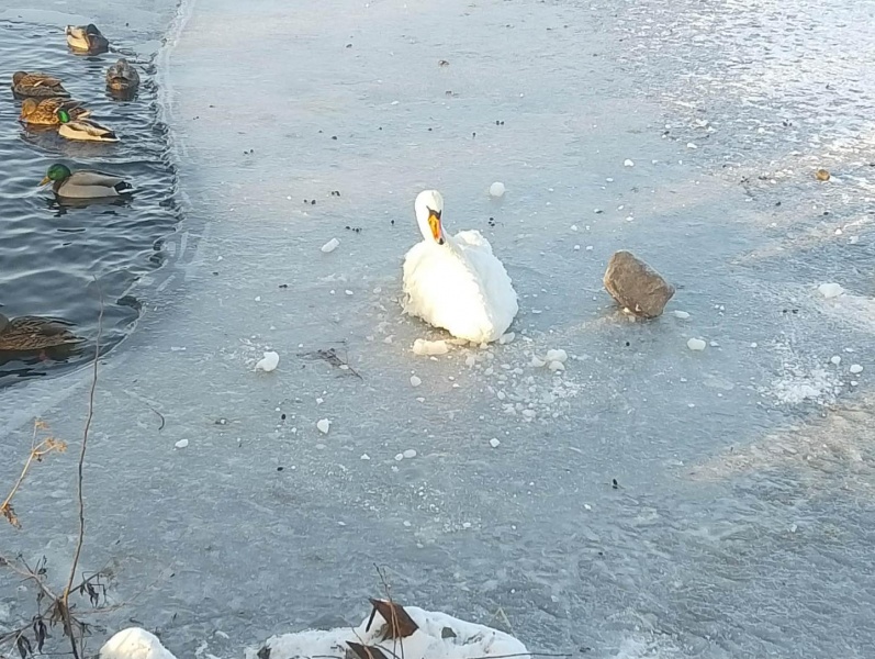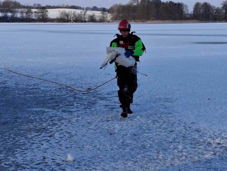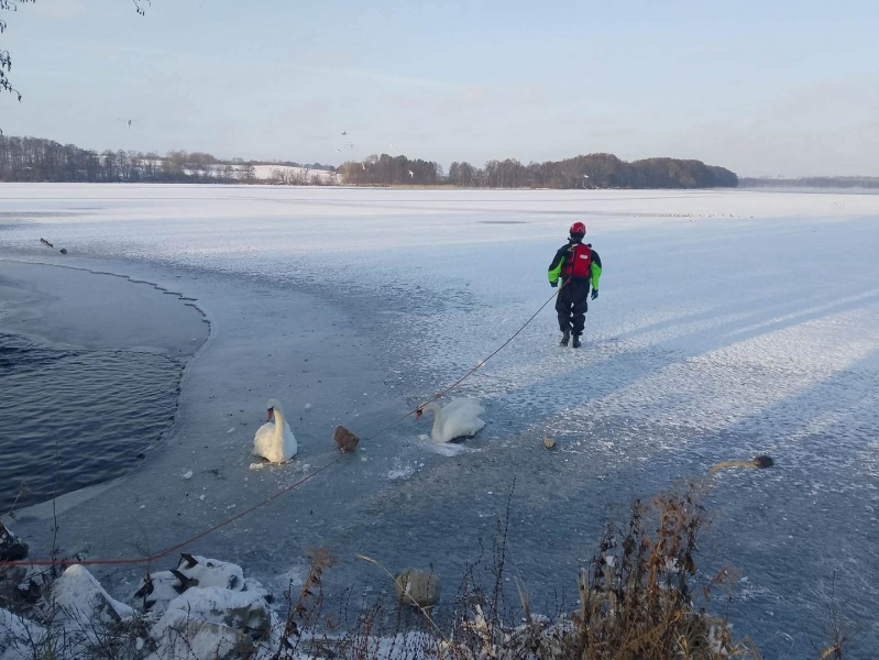 Jeden z łabędzi został odkuty jeszcze żywy. Drugi, znajdujący się około 60 metrów od brzegu, niestety nie przeżył mrozu.