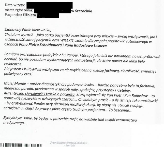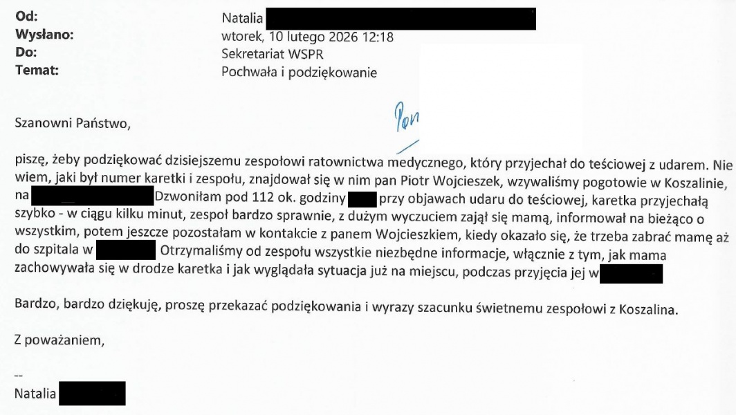 Wezwanie dotyczyło pacjentki z objawami udaru – sytuacji, w której czas ma znaczenie dosłownie medyczne, ale równie ważny jest spokój i jasna informacja dla bliskich. W podziękowaniu podkreślono szybki dojazd, sprawne działanie, a przede wszystkim to, co często zostaje niewidoczne dla postronnych: stały kontakt, tłumaczenie kolejnych kroków, cierpliwość i poczucie, że ktoś naprawdę przejmuje odpowiedzialność.
