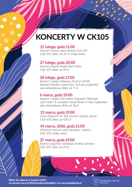 Bilety na wydarzenia dostępne są w kasach CK105 oraz online. Warto pamiętać też o koncertach z wolnym wstępem, które są świetną okazją, by po prostu przyjść i dać się wciągnąć muzyce.