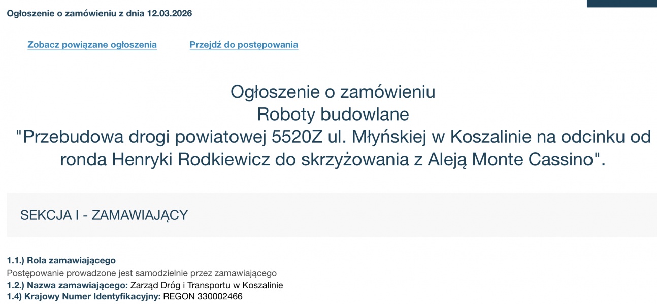 Zarząd Dróg i Transportu w Koszalinie poinformował dziś o ogłoszeniu przetargu na przebudowę ul. Młyńskiej na odcinku od ronda Henryki Rodkiewicz do skrzyżowania z aleją Monte Cassino. To jedna z ważniejszych drogowych inwestycji planowanych w tej części miasta. Zakres prac obejmie nie tylko samą jezdnię, ale również infrastrukturę sanitarną, elektryczną oraz urządzenia bezpieczeństwa ruchu.