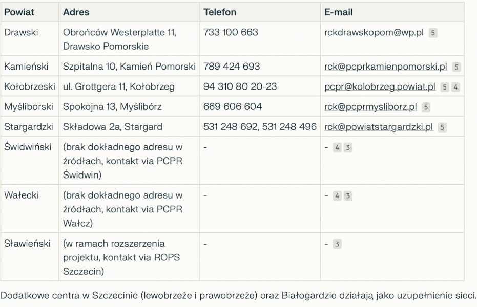 Do tej pory takie punkty powstały już w powiatach: drawskim, kołobrzeskim, myśliborskim, świdwińskim, stargardzkim, wałeckim, sławieńskim i kamieńskim. Regionalne Centra Kryzysowe funkcjonują obecnie w Białogardzie, Choszcznie, Goleniowie, Gryficach, Szczecinku, Szczecinie oraz Świnoujściu.