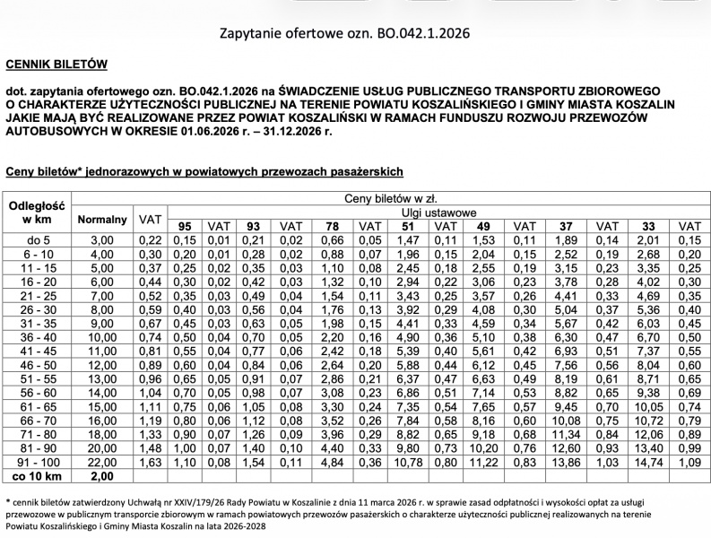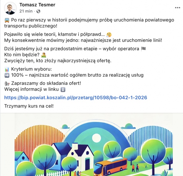 Starostwo Powiatowe opublikowało wykaz 37 linii publicznego transportu zbiorowego o charakterze użyteczności publicznej, które mają być realizowane w ramach Funduszu Rozwoju Przewozów Autobusowych w okresie 01.06.2026 – 31.12.2026 na terenie Powiatu Koszalińskiego i Miasta/Gminy Koszalin. Dla mieszkańców brzmi to jak dobra wiadomość: wreszcie coś ma ruszyć, wreszcie „będzie autobus”. Tylko że w transporcie publicznym samo „będzie” nie wystarcza. Liczy się kiedy, jak często, dokąd i czy da się z tego zbudować normalny dzień: dojazd do pracy, szkoły, lekarza, przesiadkę. I właśnie dlatego lista tras, choć imponująca liczbowo prowokuje pytanie, które warto zadać głośno: czy te linie zostały ułożone pod potrzeby pasażerów?