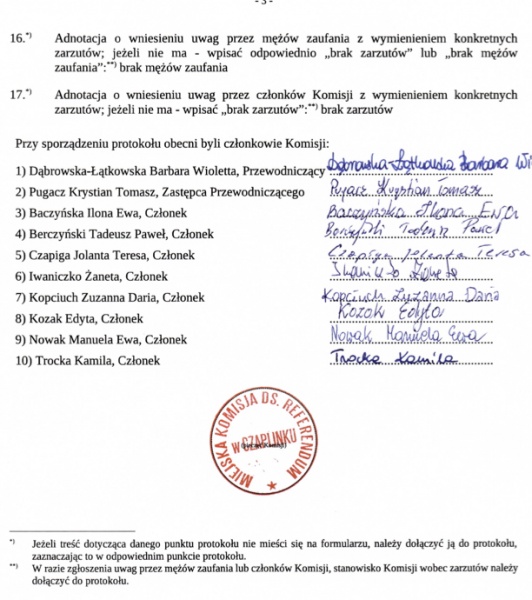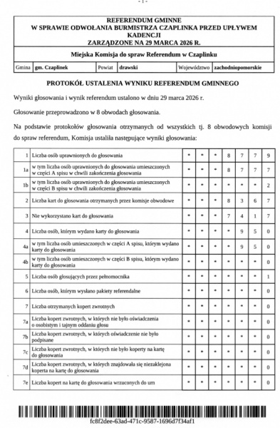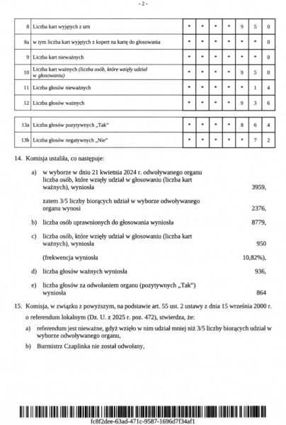 Z dokumentu wynika, że w referendum udział wzięło 950 osób, co przełożyło się na frekwencję na poziomie 10,82 proc.. Tymczasem, aby referendum było ważne, musiałoby w nim uczestniczyć co najmniej 3/5 liczby osób biorących udział w wyborze odwoływanego organu, czyli 2376 osób. W wyborach burmistrza, do których odnosił się ten próg, udział wzięło wcześniej 3959 głosujących.