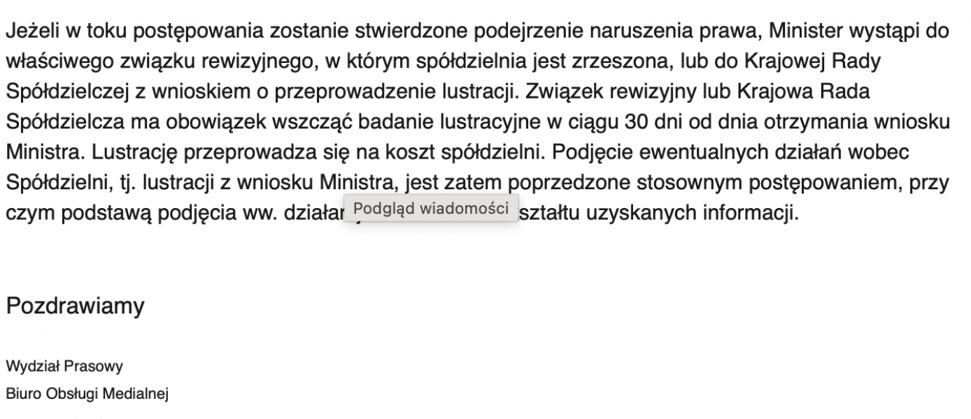 Ministerstwo wyjaśniło jednocześnie, że jeśli w toku postępowania zostanie stwierdzone podejrzenie naruszenia prawa, minister wystąpi do właściwego związku rewizyjnego, w którym zrzeszona jest spółdzielnia, lub do Krajowej Rady Spółdzielczej z wnioskiem o przeprowadzenie lustracji. Taki podmiot ma obowiązek wszcząć badanie w ciągu 30 dni od otrzymania wniosku ministra, a sama lustracja odbywa się na koszt spółdzielni.