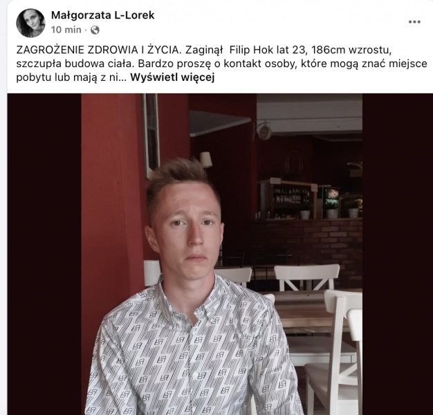 Z przekazanych informacji wynika, że Filip Hok ma 23 lata, 186 cm wzrostu i szczupłą budowę ciała. Jak podkreśla autorka apelu, sytuacja jest bardzo poważna i może stanowić zagrożenie dla zdrowia i życia zaginionego.