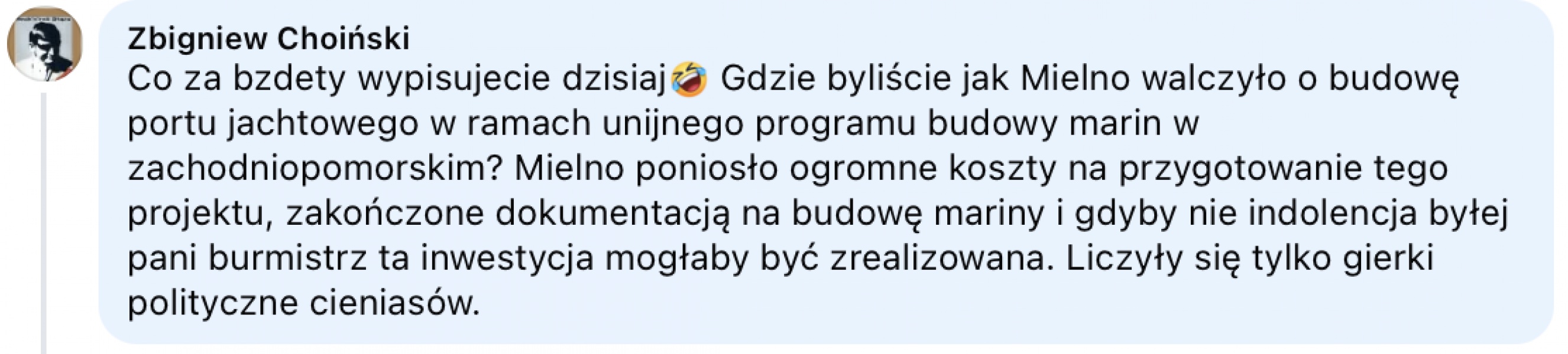 a następnie opublikował post: „Tak było z pierwszą próbą budowy portu w Unieściu. Potem już nigdy nie było tak dobrych warunków finansowania”. Do wpisu dołączył archiwalny artykuł „Głosu Koszalińskiego” z listopada 2004 roku, przypominając jedną z najważniejszych, a zarazem najbardziej kontrowersyjnych inwestycyjnych debat sprzed lat.