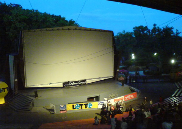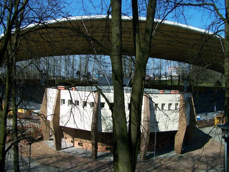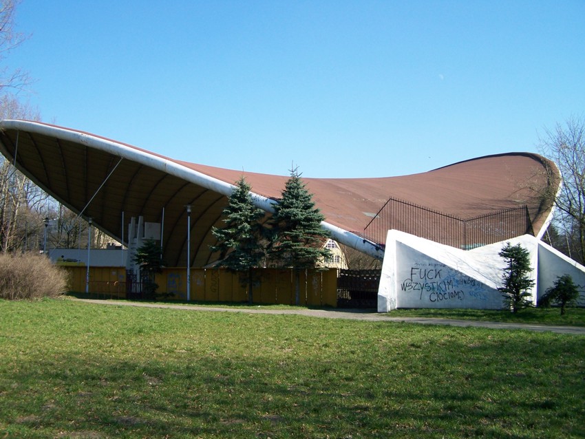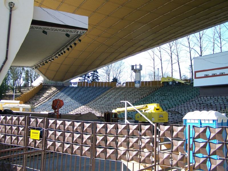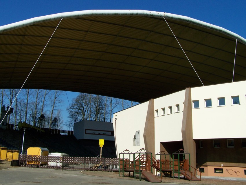 Dach wisi na dwóch wygiętych pałąkach, a część nad sceną jest zarazem obrotowym ekranem.