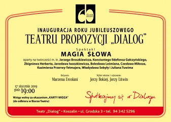 Z tej okazji zostanie zaprezentowany spektakl „MAGIA SŁOWA” w reżyserii Marzeny Ercolani. Na scenie wystąpią dialogowi aktorzy: Jerzy Bokiej i Jerzy Litwin, którzy dokonali wyboru prezentowanych tekstów.