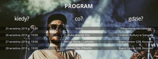Koncert inaugurujący odbędzie się 25 września w Filharmonii Koszalińskiej. Wystąpi na nim EABS czyli zespół jazzowy, który jest prawdziwą sensacją na polskiej a także zagranicznej scenie. Ich najnowszy album „Slavic Spirits” spotkał się z niezwykle entuzjastycznym przyjęciem przez krytyków i odbiorców. EABS kontynuuje tradycję polskiej szkoły jazzu, wymykając się równocześnie wielu brzmieniowym schematom, prezentując zupełnie autorskie podejście do utartych muzycznych standardów, co udowodnili na debiutanckim albumie. Płyta „Slavic Spirits” to próba kontaktu ze światem bezpowrotnie utraconej kultury, która przez niepiśmienność Słowian nigdy nie zostanie już dokładnie zbadana. Pod wpływem inspiracji rozważaniami wielu muzyków, historyków, dziennikarzy, pisarzy a nawet psychoterapeutów bardzo szybko zaczęły pojawiać się kompozycje, które zespół wydostał z głębi swojego ducha i wyobraźniKolejne dwa dni festiwalowe odbędą się w nowej koszalińskiej sali koncertowej w Koszalinie – G38. 27 września wystąpią trzy zespoły. Pierwszym z nich jest Beluga Stone. To równoległy projekt twórców grupy P.Unity, którzy stali się sensacją ubiegłorocznego Good Vibe Festivalu. Tym razem Jędrzej Dudek i Maciej Sondij prezentują mieszankę gitarowej psychodeli, soulu i hip hopu.