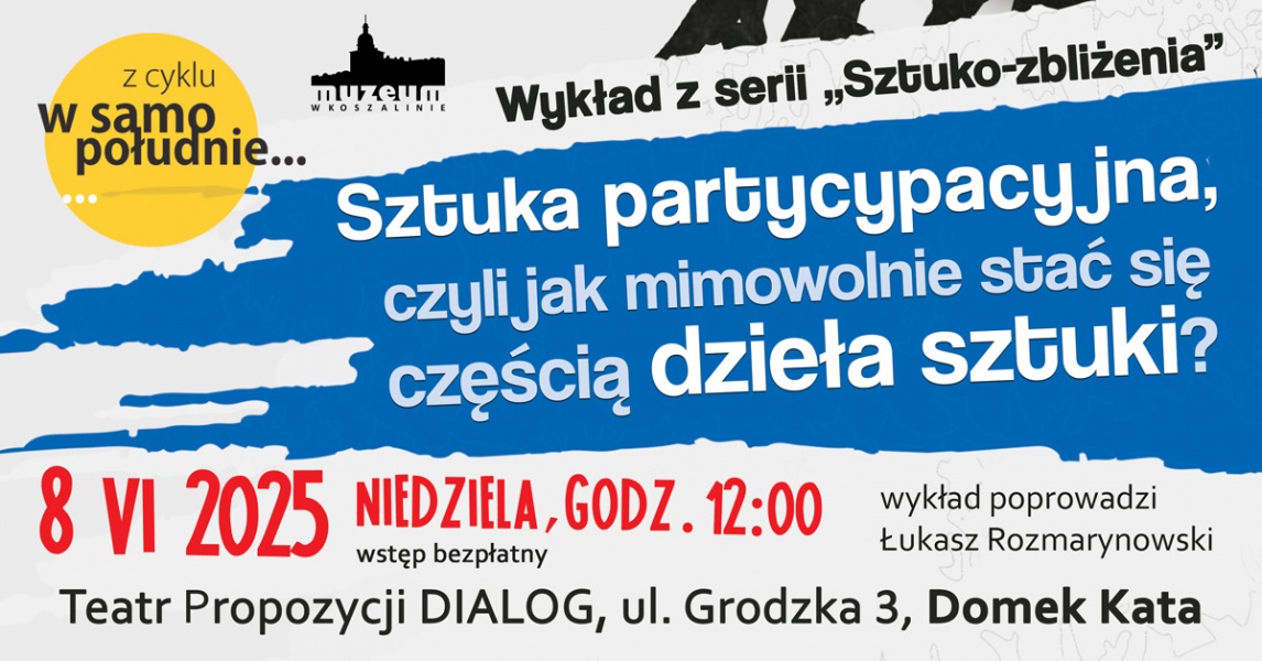 Podczas wykładu Łukasza Rozmarynowskiego, historyka sztuki i kierownika Działu Sztuki Współczesnej Muzeum w Koszalinie, dowiemy się: czym dokładnie jest sztuka partycypacyjna, jaką rolę odgrywa w niej odbiorca, jakie cele – społeczne, edukacyjne, krytyczne – może realizować i wreszcie: jak sztuka, czasem zupełnie niepozornie, zmienia nasze relacje ze światem i innymi ludźmi.