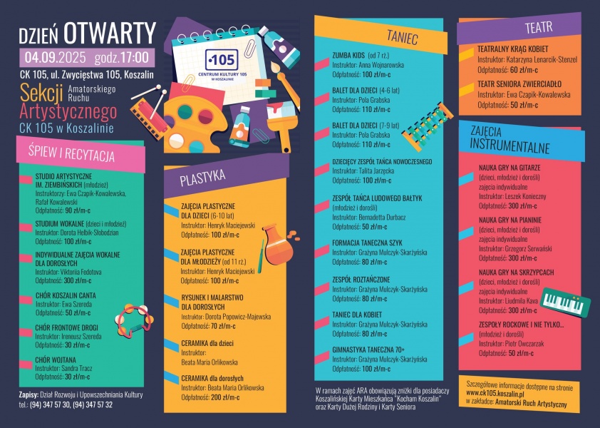 Dzień Otwarty Amatorskiego Ruchu Artystycznego w CK105 odbędzie się 4 września w godz. 17:00-19:00. To idealna okazja by zajrzeć za kulisy i po prostu zobaczyć jak to działa. W programie mamy prezentacje zespołów. m.in. występy taneczne, muzyczne, teatralne i inne formy twórczości. Zapraszamy też na spotkania z instruktorami aby poznać ludzi, którzy prowadzą u nas zajęcia.