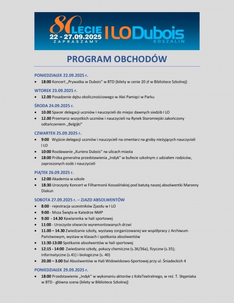 O 9:00 uczniowie i nauczyciele odwiedzą groby zmarłych pedagogów na koszalińskim cmentarzu. Godzinę później na ulicach miasta rozdawany będzie jubileuszowy numer „Kuriera Dubois”. Dzień zakończy wieczorna próba generalna spektaklu „Indyk” z udziałem rodziców i przyjaciół szkoły.