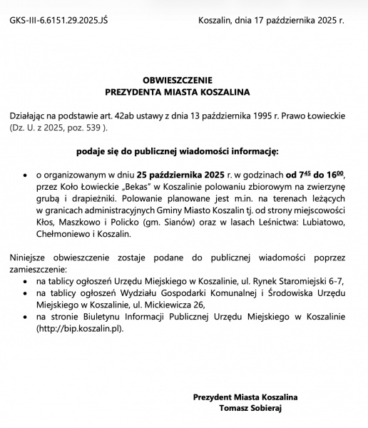 Informacja została podana do publicznej wiadomości poprzez zamieszczenie: na tablicy ogłoszeń Urzędu Miejskiego w Koszalinie (Rynek Staromiejski 6–7), w Wydziale Gospodarki Komunalnej i Środowiska (ul. Mickiewicza 26), w Biuletynie Informacji Publicznej Urzędu Miejskiego: bip.koszalin.pl.