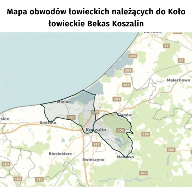 Koło Łowieckie „Bekas” prowadzi gospodarkę łowiecką na terenie obwodów nr 5 i 26, o łącznej powierzchni 16 660 ha, w tym 4 566 ha stanowią lasy.