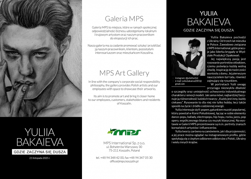 Yuliia Bakaieva pochodzi z Ukrainy, a od trzech lat mieszka i pracuje w Polsce. Zawodowo związana jest z firmą MPS International, gdzie pełni funkcję liderki brygady w Wydziale Produkcji Opakowań. Po godzinach pracy oddaje się swojej największej pasji – rysowaniu portretów ołówkiem, czemu poświęca każdą wolną chwilę.