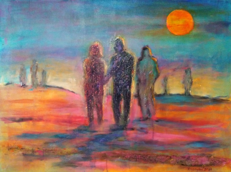 Zaprezentowane obrazy powstały w technikach akrylu i pastelu, co pozwala artystce budować zarówno wyraziste, mocniejsze akcenty, jak i bardziej delikatne, nastrojowe fragmenty. Zestawienie tych technik podkreśla emocjonalny charakter prac i ich refleksyjny wymiar.