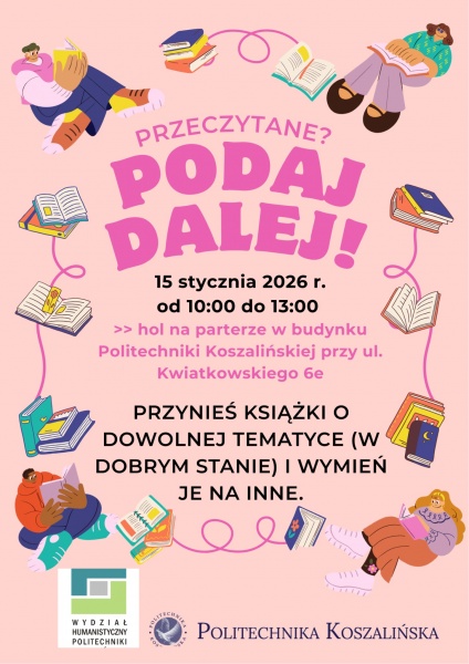 Wymianę przygotowują studenci III roku Dziennikarstwa i Komunikacji Społecznej z Wydziału Humanistycznego Politechniki Koszalińskiej. Organizatorzy zapraszają wszystkich zainteresowanych – zarówno studentów, pracowników uczelni, jak i mieszkańców, którzy chcą odświeżyć domową biblioteczkę i znaleźć nowe tytuły do czytania.