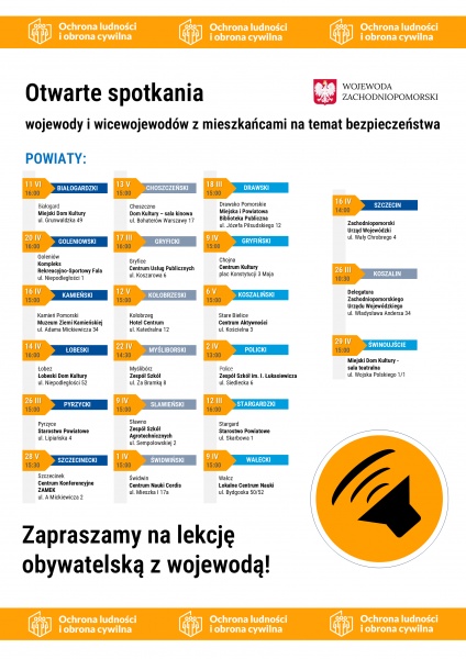 W całym województwie zaplanowano 21 otwartych spotkań, po jednym w każdym powiecie. Wezmą w nich udział wojewoda lub wicewojewodowie oraz komendanci powiatowych komend Państwowej Straży Pożarnej. Podczas spotkań mieszkańcy poznają najważniejsze zasady związane z bezpieczeństwem i ochroną ludności.