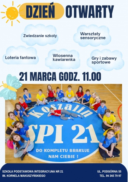 Dzień Otwarty odbędzie się w siedzibie szkoły przy ul. Podgórnej 55 w Koszalinie. To doskonała okazja, by przyjść, zobaczyć, poznać szkołę i przekonać się, jak wygląda miejsce, które może stać się ważną częścią codzienności przyszłych pierwszoklasistów.