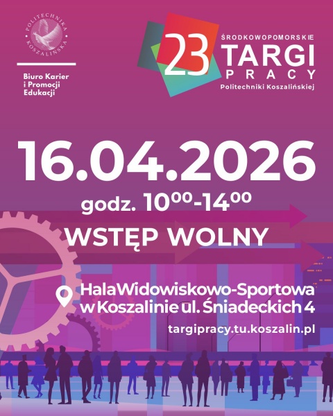 23. Środkowopomorskie Targi Pracy odbędą się 16 kwietnia w godz. 10.00–14.00 w Hali Widowiskowo-Sportowej w Koszalinie przy ul. Śniadeckich 4. Wstęp wolny.