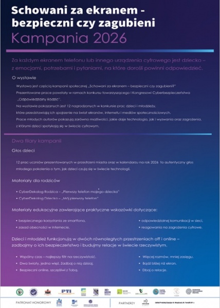 Organizatorzy podkreślają, że to nie jest temat, który można odkładać na później. To codzienność młodych ludzi, dlatego tak ważne jest, by dzieci wchodziły w świat cyfrowy z wiedzą, wsparciem i obecnością dorosłych. Właśnie temu ma służyć kampania „Schowani za ekranem – bezpieczni czy zagubieni?”, której ważnym elementem będzie oddanie głosu dzieciom i młodzieży. To oni pokażą swoją codzienność w cyfrowym świecie bez upiększeń i bez filtrów.