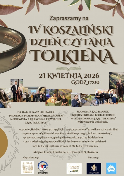 Podczas spotkania oficjalnie ogłoszona zostanie również IV edycja Ogólnopolskiego Konkursu Plastycznego „Tolkien i jego światy”, skierowanego do uczniów szkół podstawowych i średnich. Organizatorzy – Szkoła Podstawowa nr 17 w Koszalinie oraz Civitas Christiana – czekają na prace w formacie A3 lub A4, wykonane w dowolnej technice plastycznej, do 15 maja.