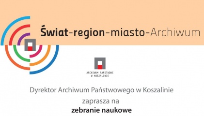 Archiwum Państwowe w Koszalinie zaprasza na zebranie naukowe: "„Działalność Archiwum Państwowego w Koszalinie w przestrzeni społecznej Pomorza Zachodniego” Świat - region - miasto – Archiwum, które odbędzie się w dniu 1 grudnia 2015 r. o godzinie 12.00 w Archiwum Państwowym w Koszalinie przy ul. M. Skłodowskiej-Curie 2aw budynku „B”. Wstęp wolny