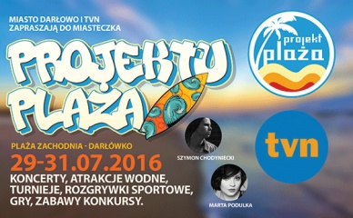Zapraszamy do wakacyjnego, plażowego miasteczka Projektu Plaża, który tym razem odbędzie się w Darłowie w dniach 29-31 lipca. Na plaży zachodniej Darłówka powstaną strefy chillout'u, w których w ciągu dnia będzie się można zrelaksować i odpocząć, skorzystać z różnych wodnych atrakcji a wieczorem wziąć udział w imprezie tanecznej i wziąć udział w koncercie Szymona Chodynieckiego lub finalistki X-Factora – Marty Podulki.
