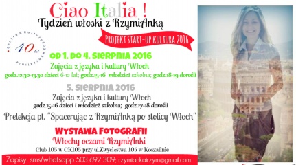 Przypomnijmy, że decyzją komisji oceniającej nadesłane do Konkursu Inicjatyw Lokalnych „Start-Up Kultura” 2016 dofinansowanie otrzymało 6 z 16 zgłoszonych projektów. Wśród nich były „Good Vibe Festival 2016” i „Targ Śniadaniowy”, które już zrealizowano. Następnym w kolejce jest „Ciao Italia. Tydzień włoski z RzymiAnką”, który do realizacji idzie właśnie teraz.