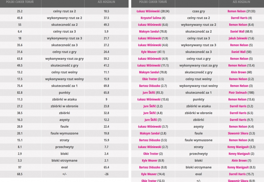 Koszalinianie zagrali prawdopodobnie najlepsze spotkanie w trwającym sezonie. - Rozegraliśmy bardzo dobry mecz, ale mimo to nie wystrzegliśmy się błędów i jesteśmy tego świadomi – mówił szkoleniowiec Akademików. Tradycyjnie największą bronią biało – niebieskich była defensywa, która sprawiała rywalom najwięcej problemów. Bardzo dobre zawody po drugiej stronie parkietu rozegrali Jakub Zalewski i Remon Nelson. Pierwszy rzucił 12 punktów, a drugi uzbierał 21 „oczek”, co jest do tej pory najlepszym wynikiem zawodnika AZS w tym sezonie.
