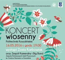 Stowarzyszenie Wspierania Rozwoju Politechniki Koszalińskiej zaprasza na Koncert wiosenny, który odbędzie się 16 maja br. w Bałtyckim Teatrze Dramatycznym (Plac Teatralny 1) o godz. 19.00. Podczas koncertu wystąpi Zosia Karbowiak oraz Zespół Kameralny i Big Band Zespołu Szkół Muzycznych im. Grażyny Bacewicz w Koszalinie.