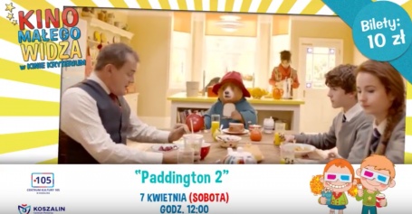 7 kwietnia, godz. 12:00 „Paddington 2” (mały popcorn za 2 zł) Reż.: Paul King; Obsada: Hugh Bonneville, Sally Hawkins, Brendan Gleeson; gat.: Familijny/Komedia/Przygodowy; Francja/ Wielka Brytania 2017; 103 min.