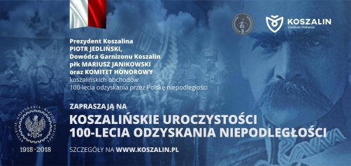 Prezydent Koszalina Piotr Jedliński, Dowódca Garnizonu Koszalin płk Mariusz Janikowski oraz Komitet Honorowy koszalińskich obchodów 100-lecia odzyskania przez Polskę niepodległości zapraszają 11 listopada 2018 roku na uroczystości patriotyczne.