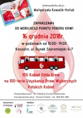 Koszalinianki chcąc uczcić ta rocznicę organizując akcję 100 kobiet Odda Krew na 100 Lecie Uzyskania Praw Wyborczych przez Polki