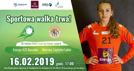 Energa AZS Koszalin – Metraco Zagłębie Lubin / 16.02.2019, godz. 17.00 Sędziują: Mariusz Marciniak (Wolsztyn) oraz Piotr Radziszewski (Wolsztyn). Delegat ZPRP: Mirosław Majchrowski (Gdańsk).