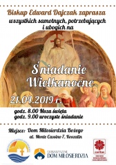 iskup Edward Dajczak zaprasza wszystkich samotnych, starszych i utrudzonych życiem na Wspólne Śniadanie Wielkanocne w Dzień Zmartwychwstania Pańskiego na godzinę 8:00 do Domu Miłosierdzia Bożego. O godzinie 8:00 Wspólna Eucharystia a po niej Śniadanie Wielkanocne.