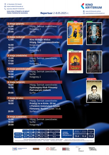 Cennik: Bilety 2D poniedziałek- niedziela: 19zł – normalny, 17zł – ulgowy, 14 zł – grupowy; 15zł - Tani Poniedziałek, Koszalińska Karta Mieszkańca (honorowana w niedziele); 15 zł – DKF, 12zł – Kino Małego Widza; 10 zł - Przeżyj to w kinie. 20 lat z Polskim Instytutem Sztuki Filmowej