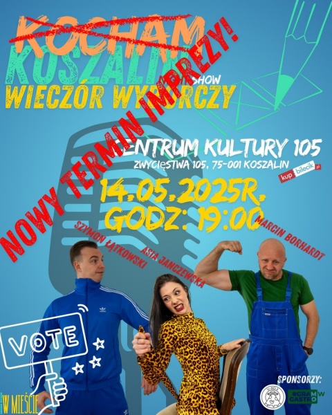 Koszalin, przygotuj się na wieczór pełen humoru, zaskoczeń i inteligentnej rozrywki. Już 14 maja na scenie pojawią się wyjątkowi goście, a wszystko to w ramach Kocham Koszalin Night Show – wydarzenia, które łączy stand-up, kabaret, improwizację i nieprzewidywalność w najlepszym wydaniu.