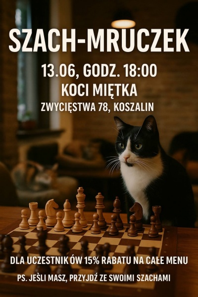 W iątek, 13 czerwca, o godzinie 18:00 Kocia Kawiarnia „Koci Miętka” w Koszalinie (ul. Zwycięstwa 78) ponownie zaprasza na nietypowe spotkanie przy szachownicy. Po sukcesie pierwszej edycji, grupa Zróbmy To Razem organizuje kolejne wydarzenie z cyklu „Szach-Mruczek”, łączące pasję do szachów z miłością do kotów.