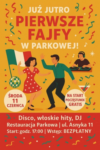 Dziś, 11 czerwca, Restauracja Parkowa przy ul. Asnyka 11 w Koszalinie zaprasza wszystkich chętnych na wyjątkowe „Fajfy” – muzyczne spotkanie z włoskim klimatem, tańcami i poczęstunkiem. Wydarzenie rozpocznie się o godzinie 17:00, a udział w nim jest bezpłatny.