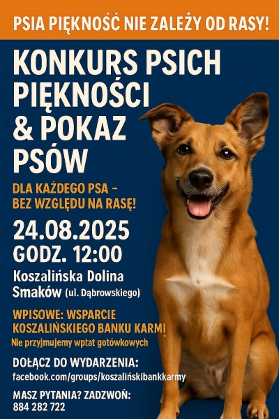 Już 24 sierpnia 2025 roku o godzinie 12:00 w Koszalińskiej Dolinie Smaków (ul. Dąbrowskiego) odbędzie się niecodzienne wydarzenie – Konkurs Psich Piękności & Pokaz Psów. Wydarzenie skierowane jest do wszystkich psów, bez względu na rasę, a w szczególności do nierasowych pupili – kundelków, adopciaków i wszystkich, którzy na co dzień nie pojawiają się na wystawowych ringach.