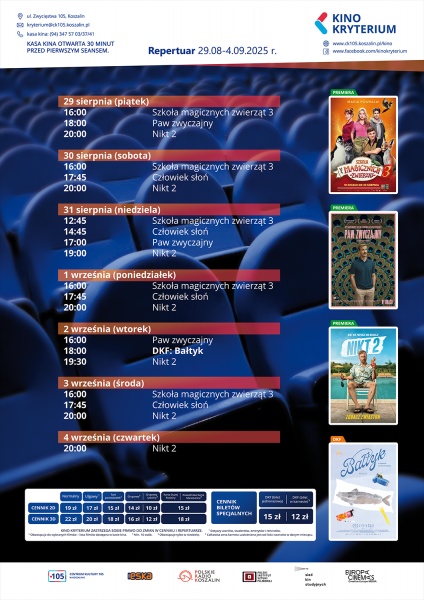 Kino Kryterium zaprasza. Cennik: Bilety 2D poniedziałek- niedziela: 19zł – normalny, 17zł – ulgowy, 14 zł – grupowy; 15zł - Tani Poniedziałek, Koszalińska Karta Mieszkańca (honorowana w niedziele); Bezpieczne Wakacje: 2 zł – dzieci z Koszalina, 10 zł – pozostali.
