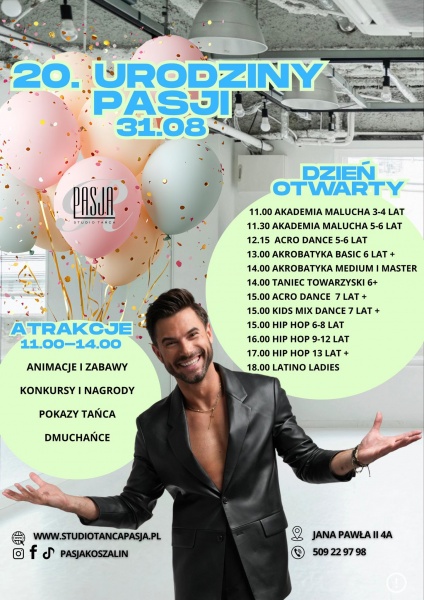 Studio Tańca PASJA zaprasza wszystkich mieszkańców Koszalina i okolic na wyjątkowe Dni Otwarte, które odbędą się w niedzielę, 31 sierpnia 2025 roku, na Osiedlu KSM Przylesie. To nie tylko okazja do wspólnej zabawy i poznania oferty studia, ale także świętowanie 20. urodzin PASJI – miejsca, które od dwóch dekad zaraża miłością do tańca!